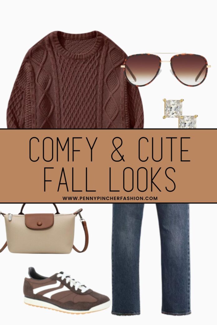 A brown cable knit sweater paired with denims is a fall traditional. Preserve it informal and comfortable with brown sneakers, then add a beige crossbody purse to drag the look collectively. That is the form of outfit you’ll put on on repeat as a result of it’s simple but trendy.