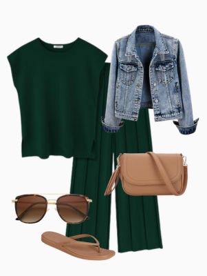 Begin with a forest inexperienced knit matching set as a result of it feels intentional however easy and we love a monochrome look! The deep inexperienced reads elevated moderately than festive, which makes it wearable far past St. Patrick’s Day. Throw on a basic jean jacket to maintain the look informal and grounded, then end it with flip flops and a easy purse.