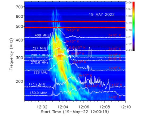 Right here we report an uncommon wide-band excessive frequency type-II burst on 19 Could 2022 with beginning frequency as excessive as 670 MHz and an instantaneous bandwidth as broad as 300 MHz, as recorded by the ORFEES spectrograph (see Determine 1). Such bandwidth is far wider than regular occasions. As well as, at any particular frequency the burst lasts for two minutes. That is additionally for much longer than regular bursts. Simultaneous observations of extreme-ultraviolet (EUV) and radio imaging from the Nançay Radio Heliograph (NRH) can be found for this occasion. This enables us to measure the placement of radio sources over the EUV shock construction and to discover the reason for the high-frequency wide-band characteristic.