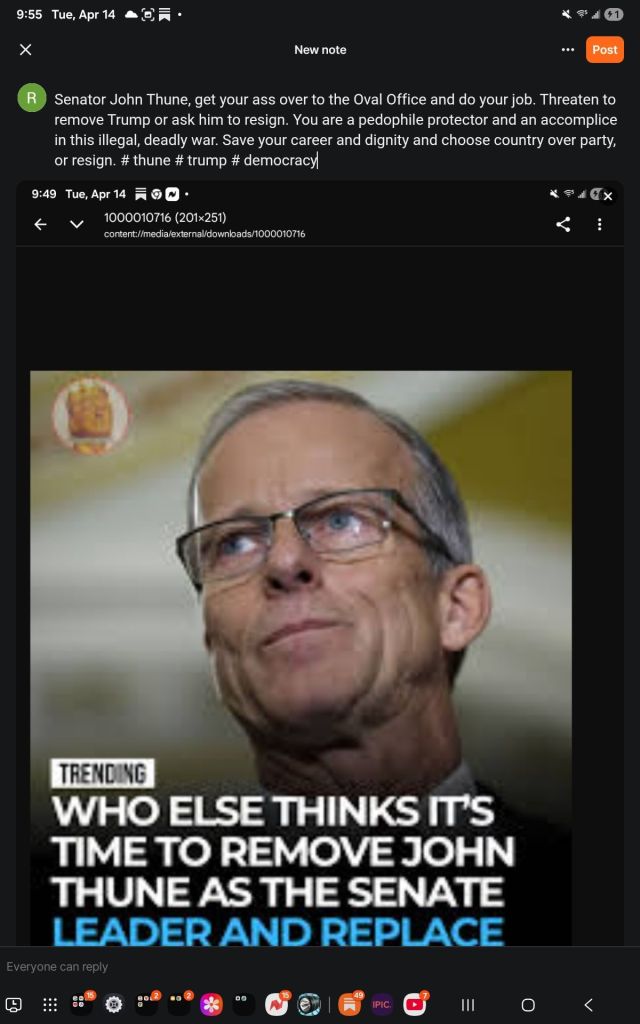 HOW MUCH WORSE DOES IT HAVE TO GET IN AMERICA FOR MAJORITY LEADER SENATOR JOHN THUNE TO CALL ON THE HOUSE AND  SENATE TO IMPEACH AND REMOVE DONALD TRUMP? THE ONLY REASON TRUMP HAS SUCCEEDED AT DESTROYING THE GREATNESS OF AMERICA IS BECAUSE REPUBLICANS PREFER POWER AND AUTOCRACY OVER DEMOCRACY. ISN’T THERE A CRIME THERE TO PROSECUTE?