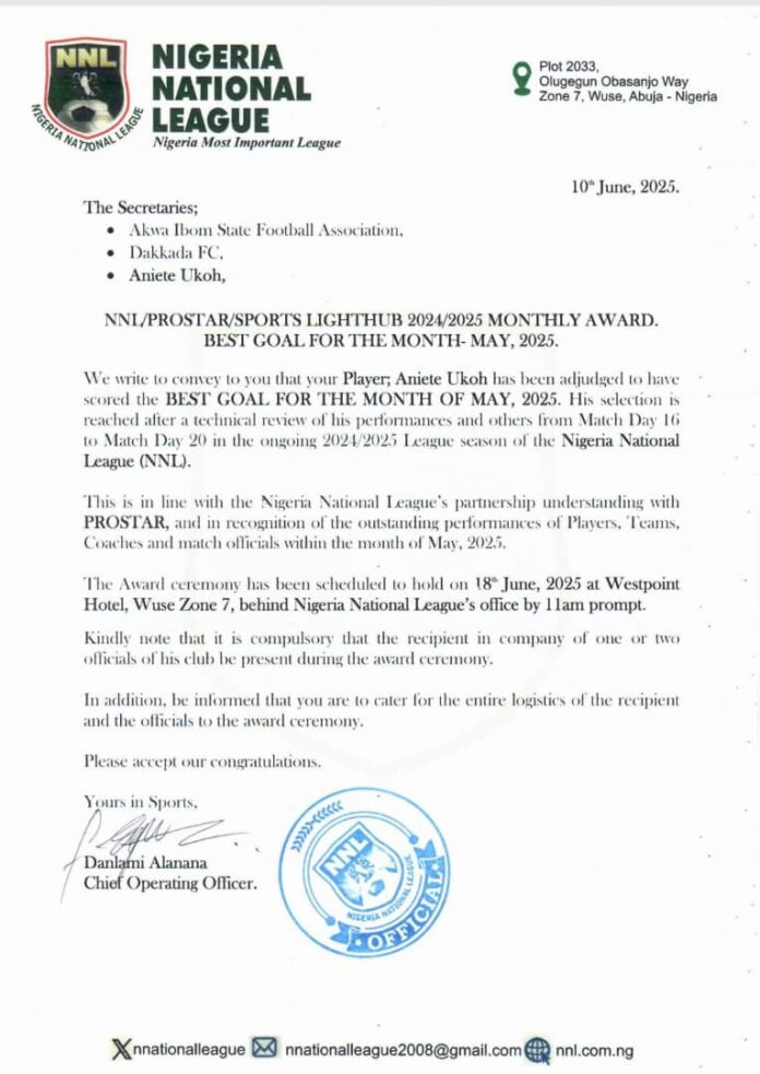Anietie Uko of Dakkada FC, has been introduced because the winner of the Nigeria Nationwide League (NNL) Purpose of the Month award for Could 2025.