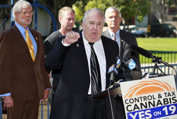 Retired LAPD deputy chief Stephen Downing at a lectern throughout a press convention in September 2010 for Proposition 19, a then California poll measure to regulate and tax marijuana.