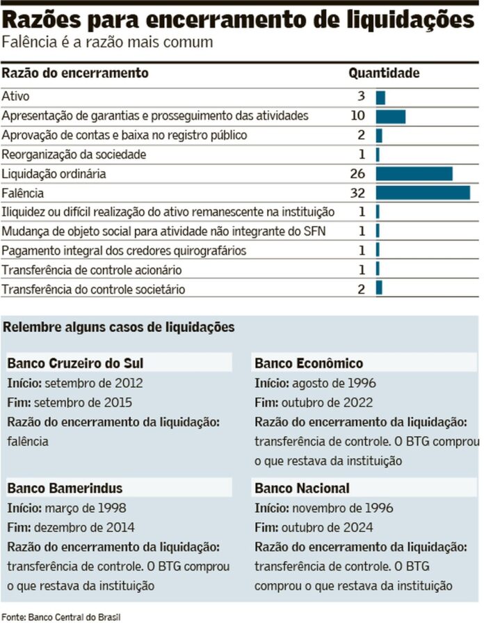 A maior parte das liquidações extrajudiciais de bancos decretadas pelo Banco Central (BC) terminou em falência ou em liquidação ordinária da instituição. O Valor levantou as 80 liquidações de bancos comerciais ou múltiplos da história e 58 desses processos tiveram esse desfecho. A primeira liquidação foi em 1966.