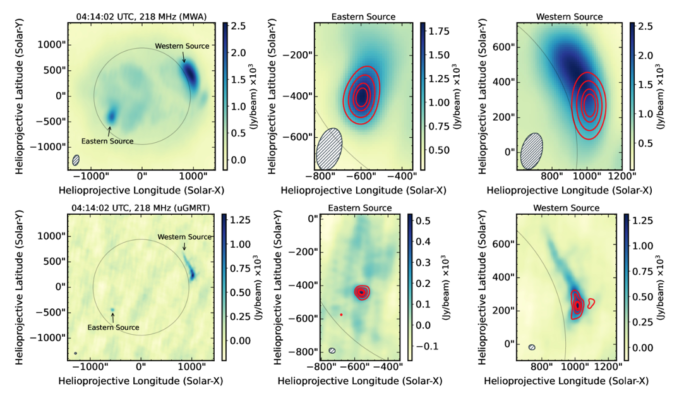 Determine 1. Simultaneous detection of linearly polarized emission at 218 MHz with the MWA (high panels) and uGMRT (backside panels). The left panels present the full-disk discipline of view with two shiny limb sources marked; the center and proper panels present zoomed-in views. Crimson contours denote linear polarization depth at 0.4, 0.6, 0.8, and 0.9 of the height, and the black circles mark the optical photo voltaic disk. Each sources exhibit partial linear polarization. The japanese supply, weaker in Stokes I, reveals larger LP fractions of 13.5 ± 0.5% (MWA) and 12.3 ± 2.0% (uGMRT), whereas the brighter western supply reveals decrease LP: 6.0 ± 0.3% (MWA) and 5.9 ± 0.5% (uGMRT).