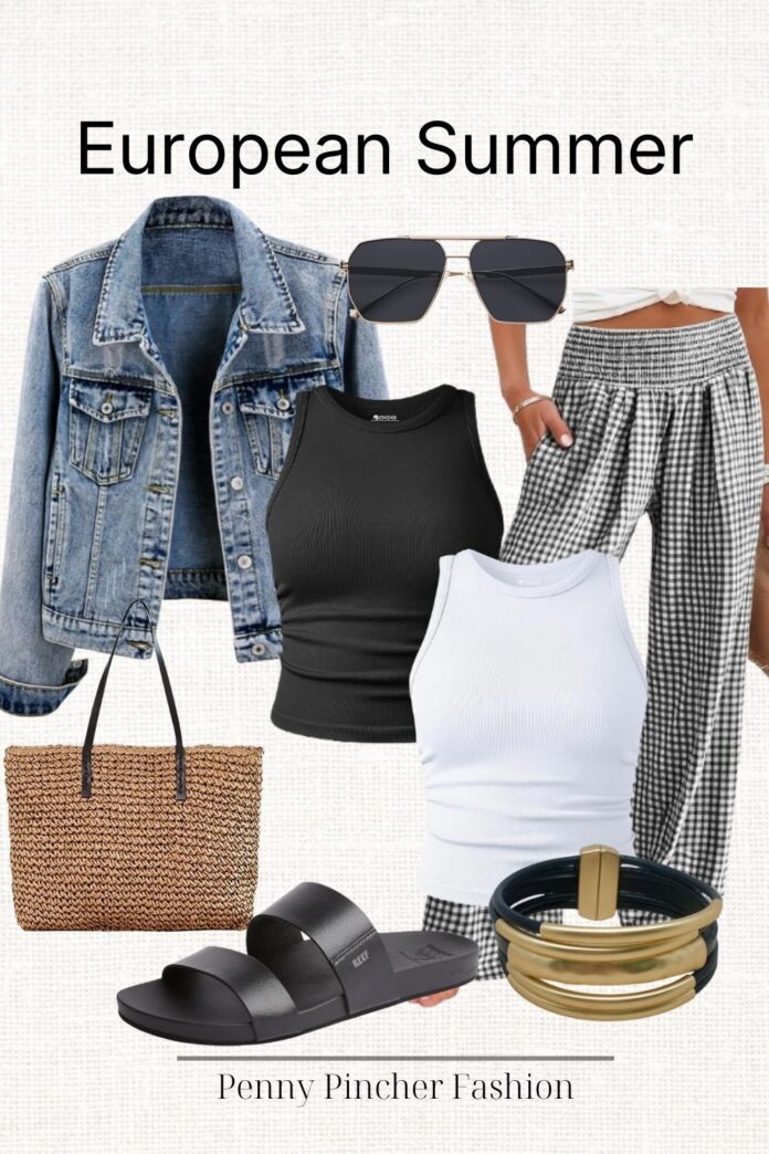 This look feels very “morning espresso in Paris.” The black fitted tank retains issues modern, whereas the gingham trousers add that basic European print. Layering a light-wash denim jacket over your shoulders immediately elevates the outfit.
