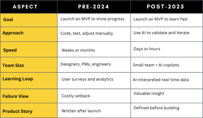 A. Earlier than 2024, MVPs had been handbook and resource-heavy. After 2025, AI makes it potential to check, construct, and validate merchandise quicker, cheaper, and with higher information.