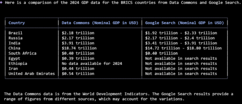 Moreover, as a result of the Information Commons pulls from authoritative data sources, it may be used to floor or evaluate knowledge to cut back hallucinations. A developer may, for example, evaluate knowledge returned by Information Commons with knowledge returned by a Google Search.