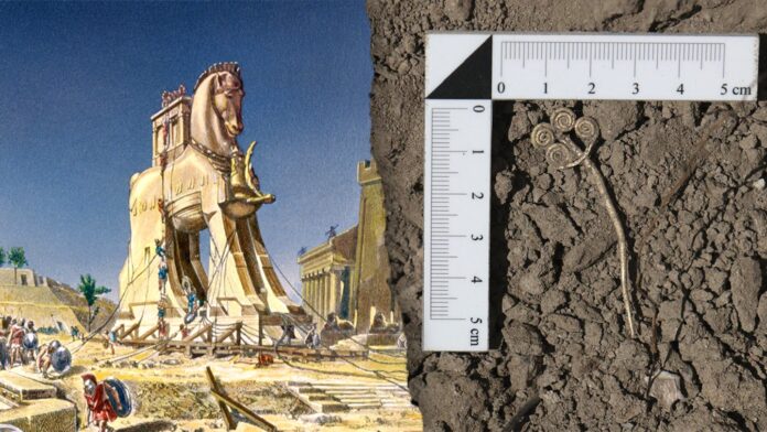 Archaeologists in northwestern Turkey uncovered a golden brooch and uncommon jade stone within the stays of the traditional metropolis of Troy. (Bettman through Getty Photographs; @MehmetNuriErsoy through X)
