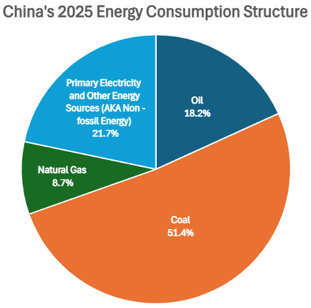 Chart made by writer. In keeping with the Nationwide Bureau of Statistics, coal made up 51.4 p.c of whole power consumption in 2025 and “clear power” accounted for 30.4 p.c, together with pure fuel. That leaves oil at 18.2 p.c.