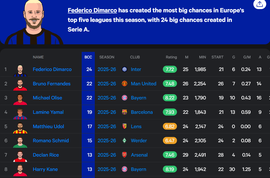 Federico Dimarco is within the 99th percentile for assists (14) and anticipated assists at 12.48, based on footystats.