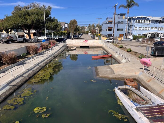 The northern finish of Venice Seaside’s Grand Canal, with the general public boat launch on the correct. The proposed Venice Dell low-income housing undertaking would straddle this a part of the waterway, which bisects a metropolis parking zone two blocks from the seaside.