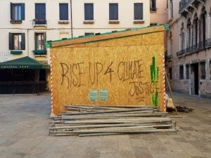 Graffiti studying ‘Rise Up 4 Local weather Justice’ on a wood building panel in Campo Santa Marina, Venice, Italy. (Picture Credit score: Mænsard vokser, CC BY-SA 4.0, through Wikimedia Commons).