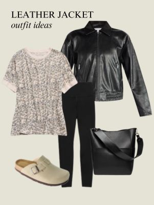 1. Leather-based Bomber Jacket + Outsized Leopard Tee + Leggings + Clogs