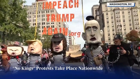 DUNCAN: At present, organizers say at the least seven million People took to the streets protesting what many referred to as an abuse of energy by President Trump. Home Speaker Mike Johnson referred to as it, quote, the “hate America rally.” Right here in New York Metropolis, police say 100,000 folks turned out at a number of marches. They report no arrests. There have been greater than 2,600 occasions from coast coast. They’re all a part of the “No Kings” motion, which accuses the president of behaving extra like a monarch than an elected official.