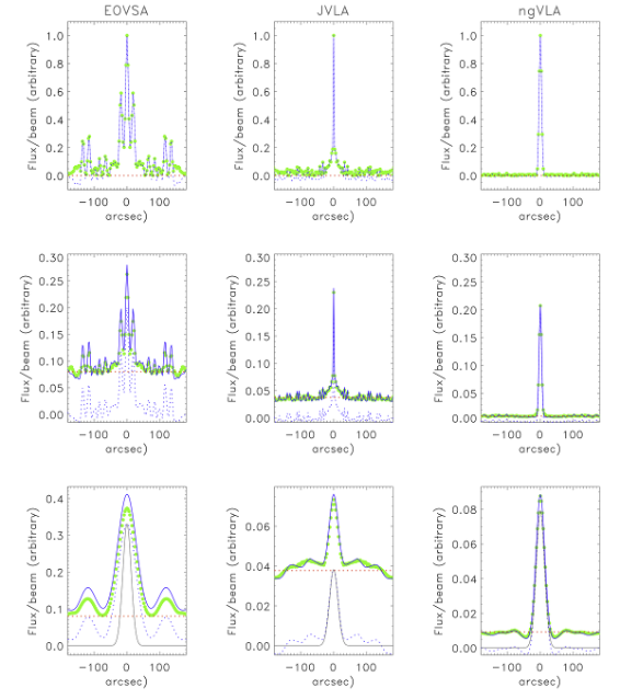 Determine 1: Comparability of mannequin sources noticed by EOVSA, the JVLA, and the proposed ngVLA at a nominal frequency of 6 GHz. In every panel the dashed blue line represents $mathcal{I}_D$, the strong blue line is $|mathcal{I}_D+S/sqrt{2n_b}|$, the dashed pink line represents the noise ground, and the inexperienced symbols hint $sigma_n$. High row: the map and map rms noticed for a degree supply with $S = 1$; Second row: the identical for a degree supply with a flux density $S_{rm pt} = 0.2$ and a complete flux $S_{rm pt} +S_{rm bg} = 1$; Third row: The identical for a Gaussian supply with $theta_G = 30″$ and a complete flux $S = 1$. In all instances $N=0$. Be aware the variations in scale for the ordinate.