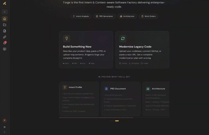 Forge captures  intent as a machine-readable, dwelling specification that serves as a shared supply of reality between people and AI, whereas constructing a persistent context layer with safety, coverage and guidelines. A modernization blueprint helps organizations reverse-engineer .NET monoliths, COBOL, Java and React into dwelling specs whereas preserving habits and refactoring to fashionable architectures, the corporate wrote.  These machine-readable specs drive improvement, mapping agent actions and implementing coverage and laws for compliance.