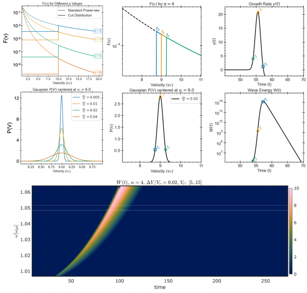 Determine 1. Illustration of the time-dependent instability at a set location (tailored from Krasnoselskikh et al. 2025). Prime left: energetic-electron distribution $F(V)$ for 4 totally different power-law tails. Prime center: energy regulation with index $alpha = 4$; vertical-coloured strains mark the truncation on the entrance at three successive occasions $t_1 < t_2 < t_3$. Backside left: Gaussian likelihood distribution $P(V)$ of wave section velocities centered on the resonant velocity $v_r$, with 4 totally different widths and backside center panel exhibits for $Delta V / V_r = 0.02$; symbols present the relative place of the entrance on the identical 3 times. Prime proper: instantaneous linear progress charge $gamma(t)$, which peaks when the entrance overlaps the middle of the resonant band ($t_2$) and turns into unfavorable as soon as slower electrons dominate ($t_3$). Backside proper: corresponding wave power $W(t)$, obtained by integrating $gamma(t)$, displaying a fast rise and slower decay; the symbols $t_1$, $t_2$, and $t_3$ are constant throughout all panels. Backside panel exhibits the evolution of Langmuir wave spectrum at some given distance, pushed by an lively inhabitants of electrons with $alpha = 4$ and $Delta V/V_R = 0.02$. The spectrum consists of waves with resonant velocities (in models of thermal velocity), $V_R = 5-15 V_T$.