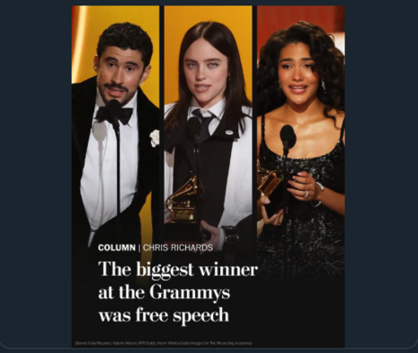That Democrat rag The Washington Put up tweeted this: “Politics are sometimes handled like radioactive materials on Grammy night time, writes Put up pop music critic Chris Richards. However on Sunday, one thing modified. The world outdoors had lastly change into too loud to disregard.” The headline beneath: “The largest winner on the Grammys was free speech.”