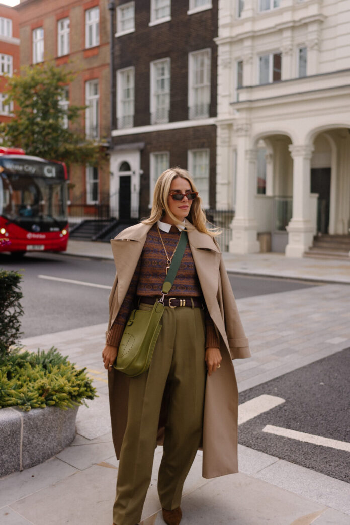 Co Trench, Soeur Sweater, Blaze Milano Pants (previous, comparable right here and right here), Hermes Bag (comparable right here), Gucci Sun shades, Khaite Belt (previous, comparable right here and right here), Aeyde Boots